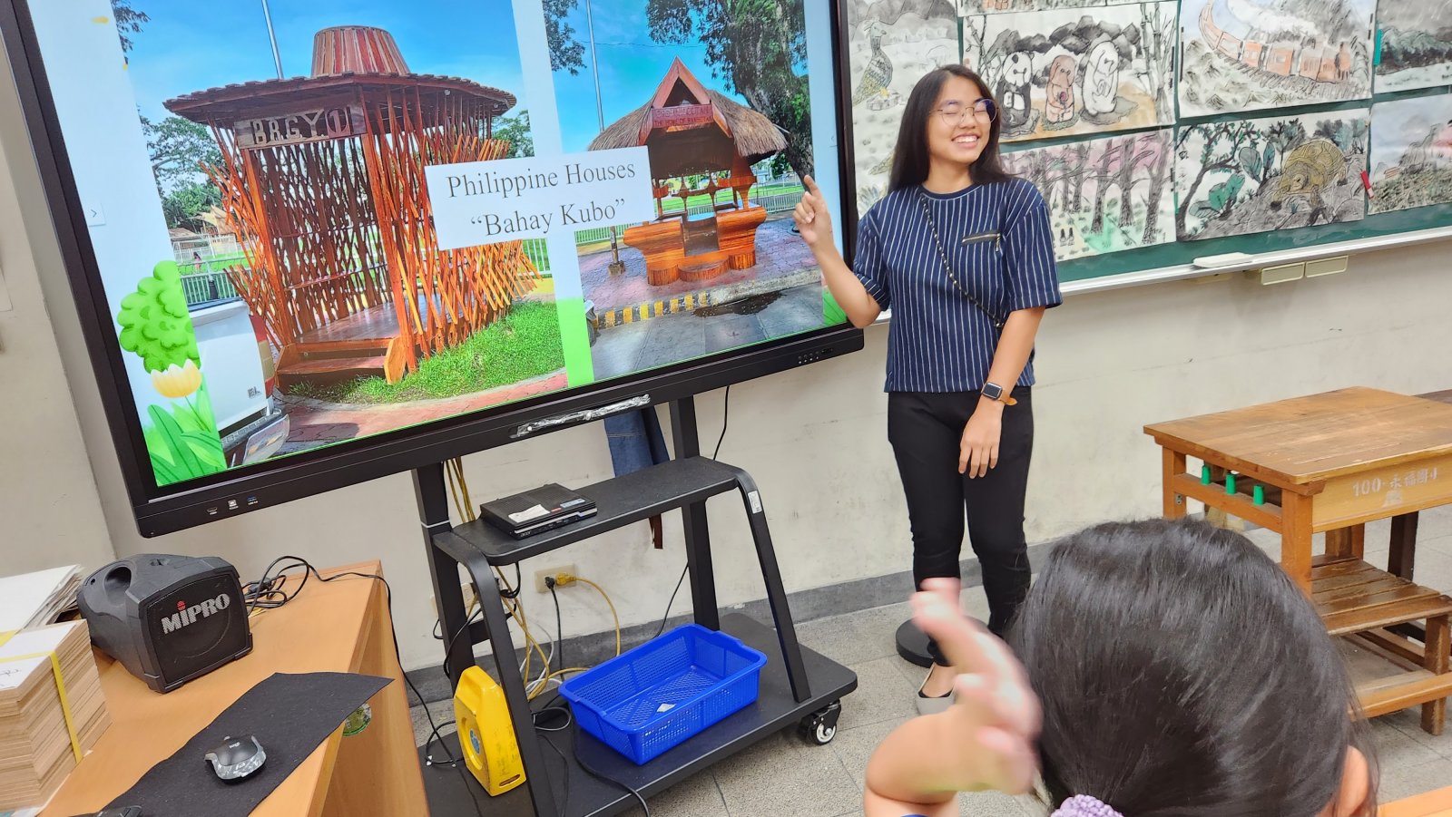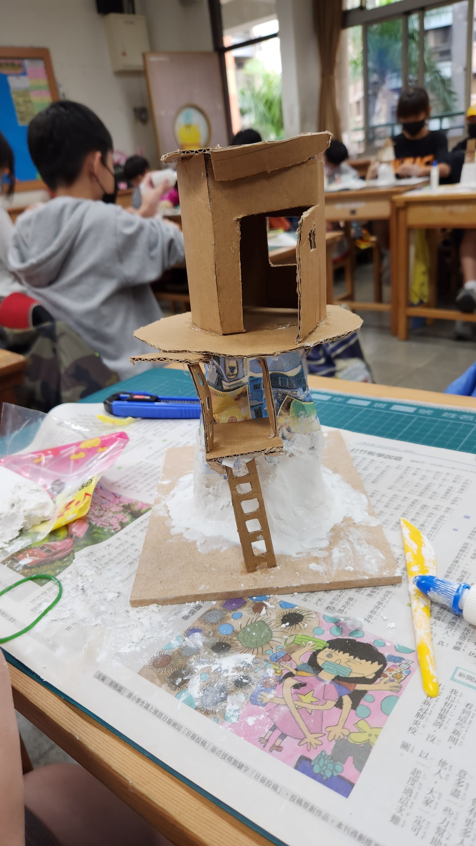 課程設計是發展學生的建築美學,透過介紹台北大稻埕以及外師Iriz故鄉的傳統建築,加上不同國家的怪異設計的建築物,激發學生的想像力及學習興趣,接著,使用平板進入AIGC生成平台,透過每個學生奇特的關鍵提示詞,以文生圖更能生成概念設計圖,接著,指導學生運用身旁周遭的回收物(包含: 牛奶紙盒、瓦楞紙版、免洗筷、紙杯、寶特瓶等),組合成建築的結構,然後再以紙黏土鋪上結構的表面並製造出微小的細節朔造你真的效果,最後,再以壓克力顏料上色並巧妙的黏上草粉,完成一座相當具奇特與創意的建築物。