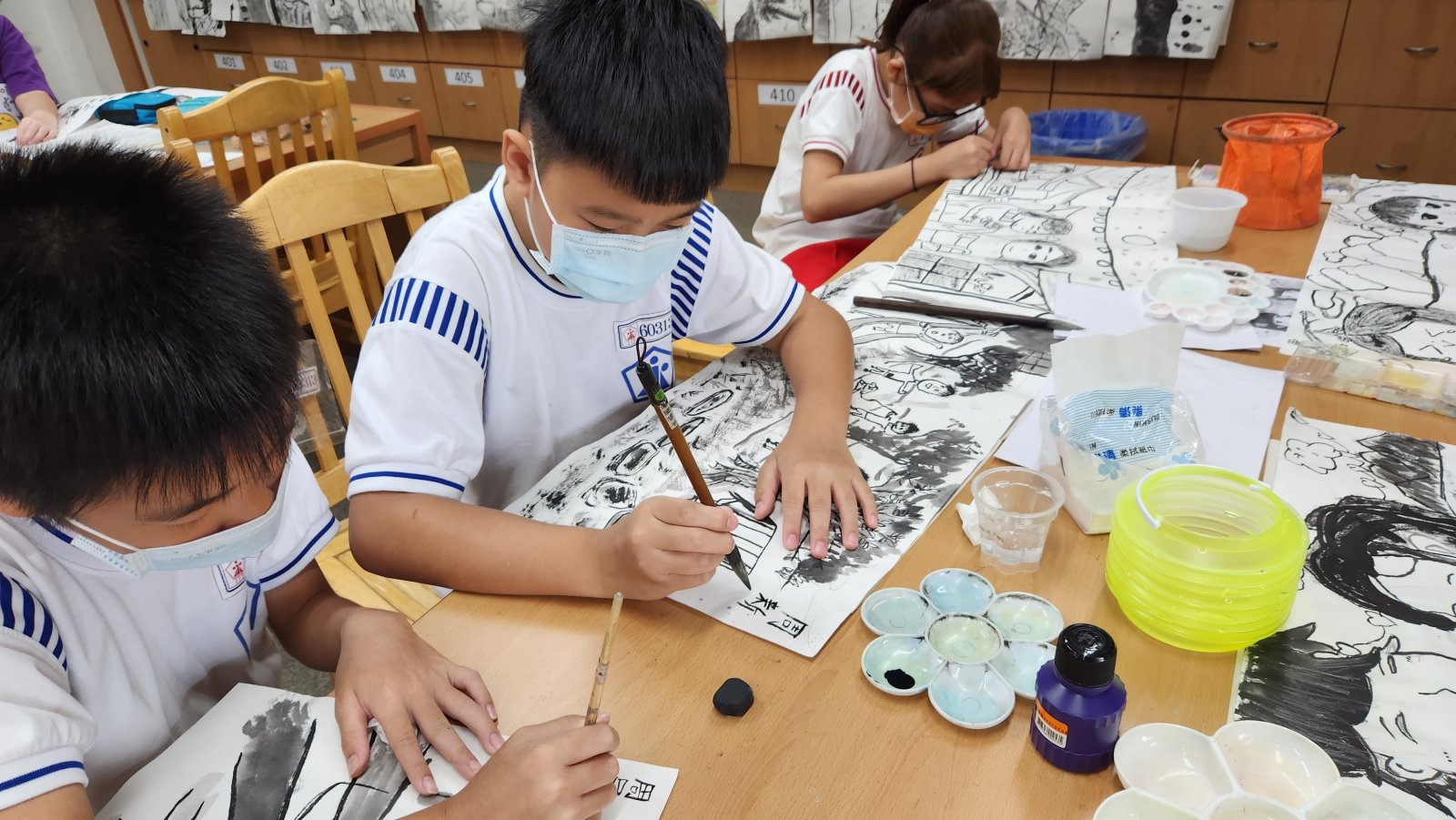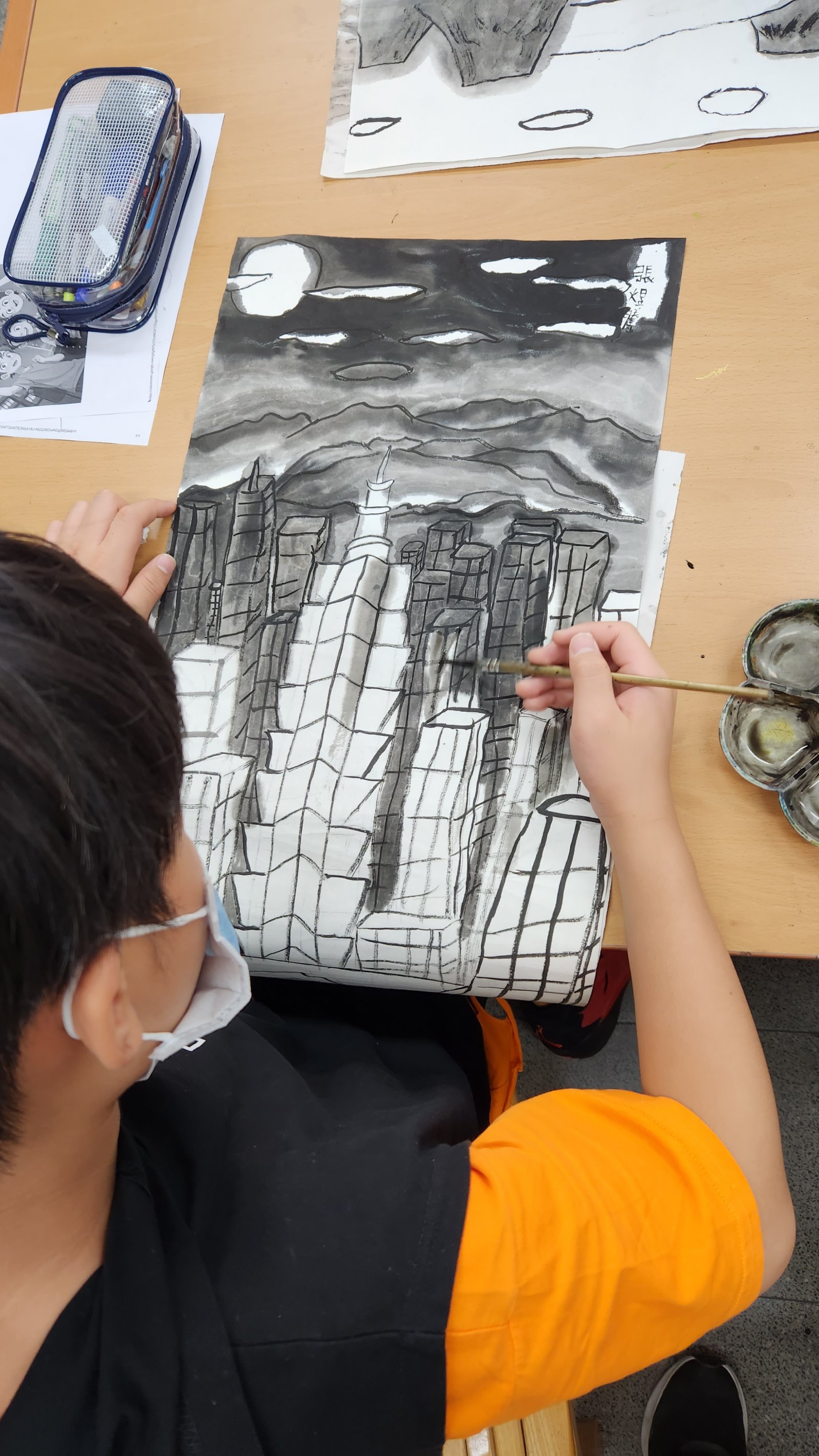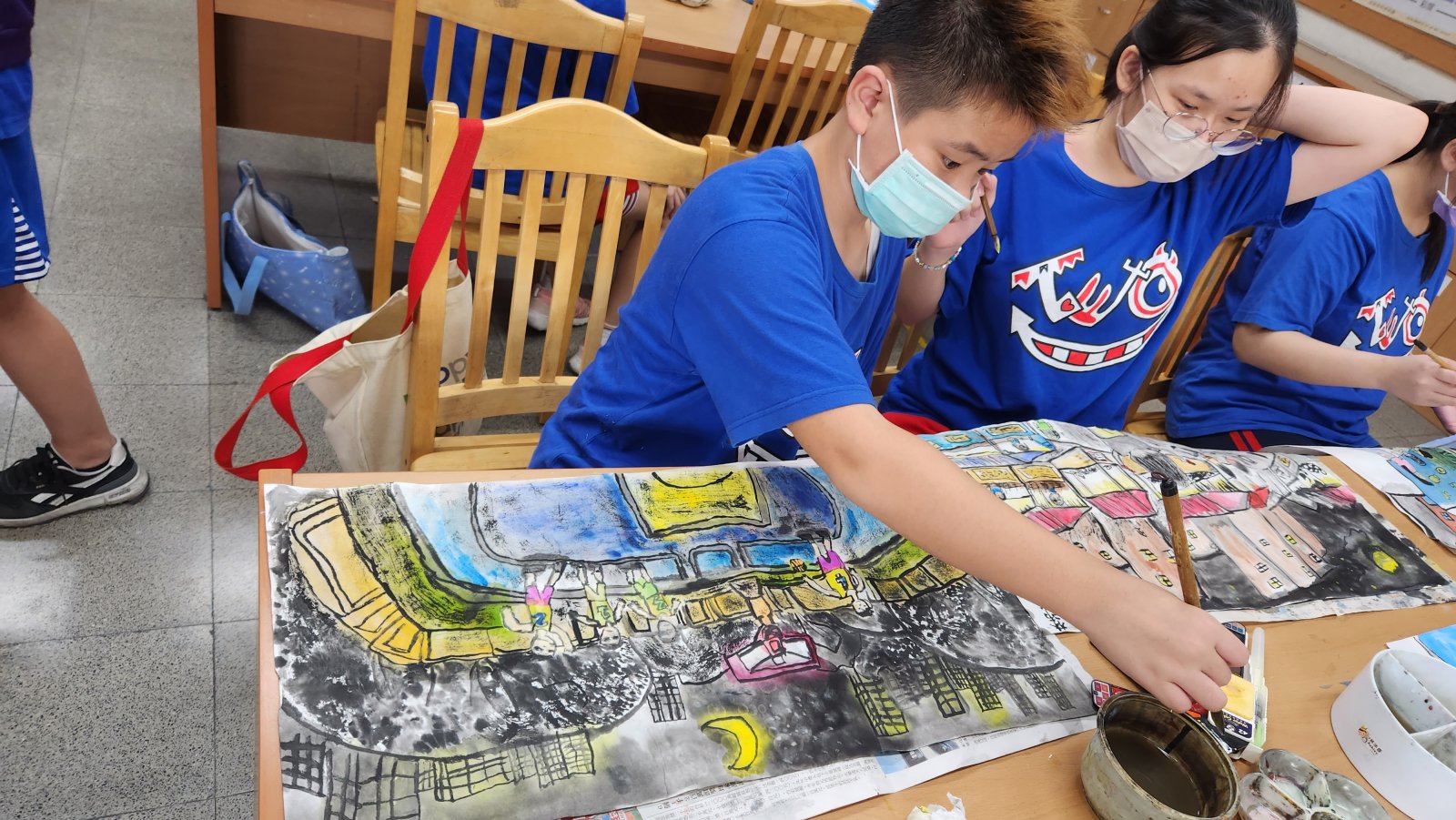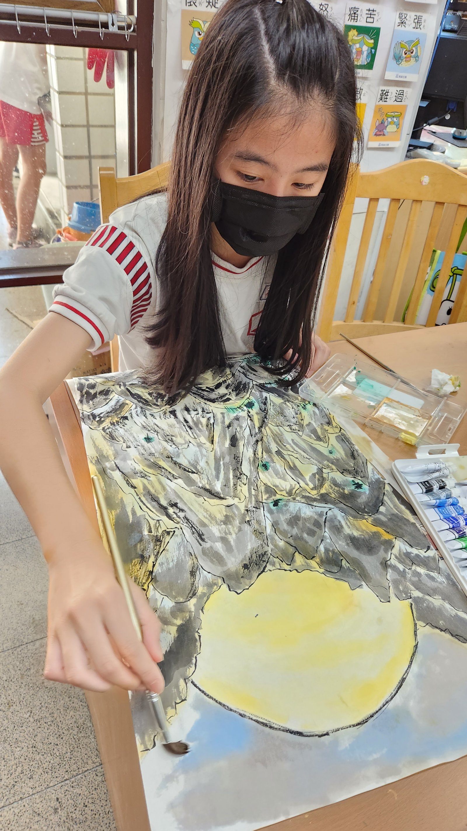 課程設計是由學生的日常生活經驗出發,指導學生運用作文寫作技巧-6何法(人、事、時、地、物以及如何),撰寫出關鍵提示詞,再結合AIGC生成式繪圖文生圖的功能,製作出設計概念圖,接著再指導學生運用構圖法則以及水墨技法進行創作,完成出一幅幅令人驚豔、充滿想像的作品。