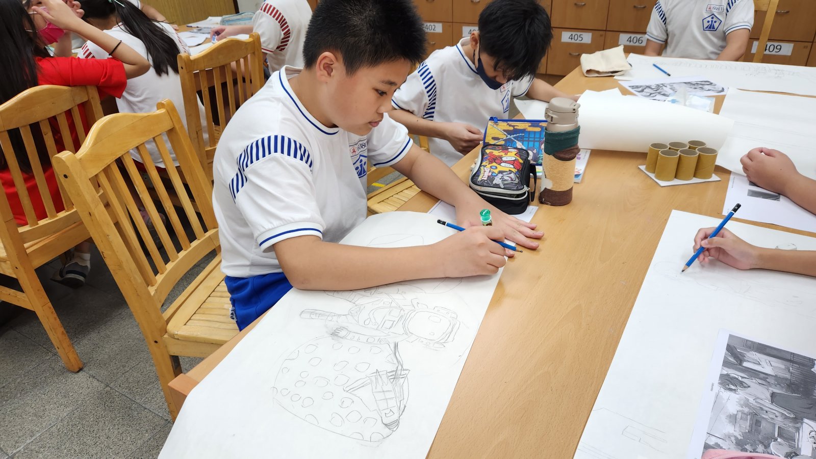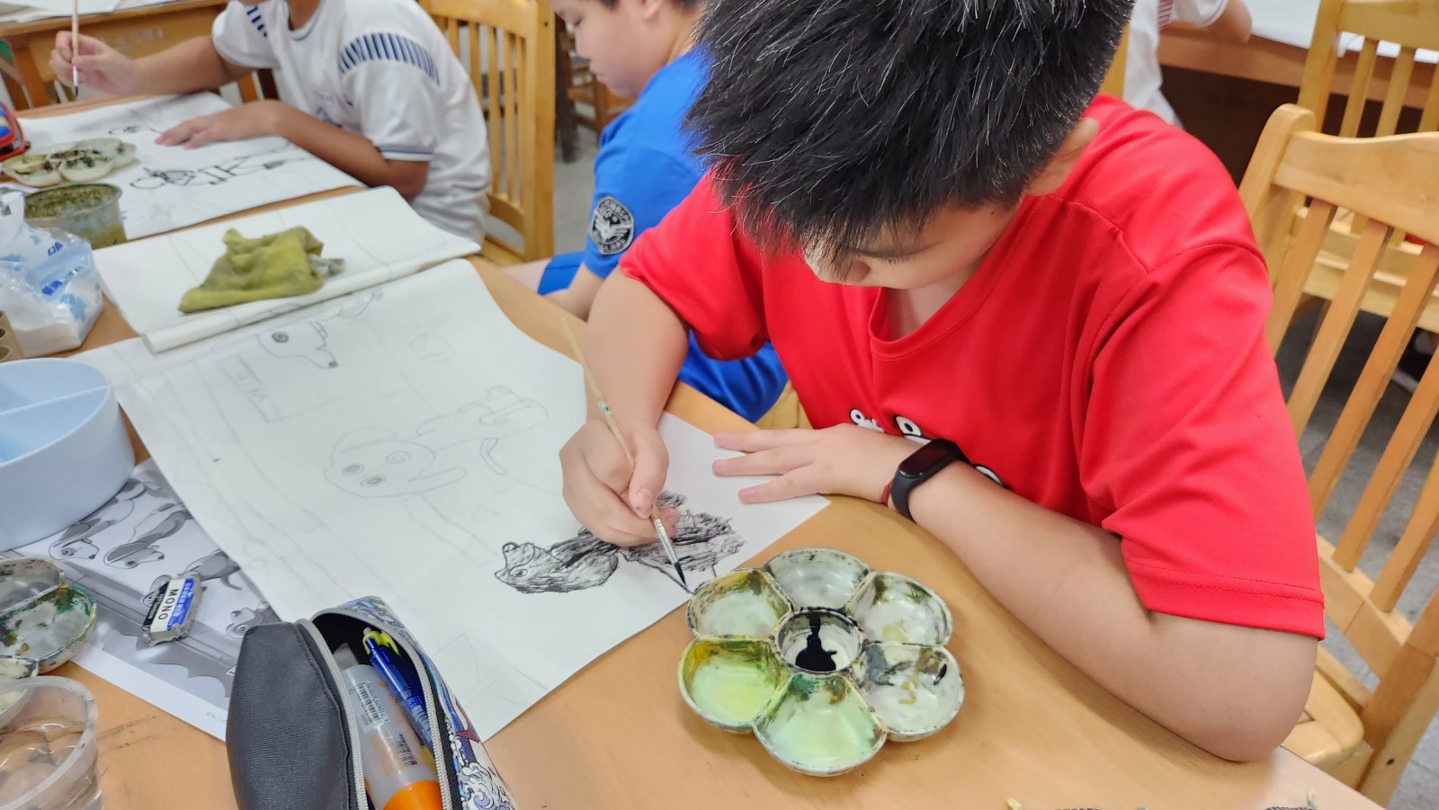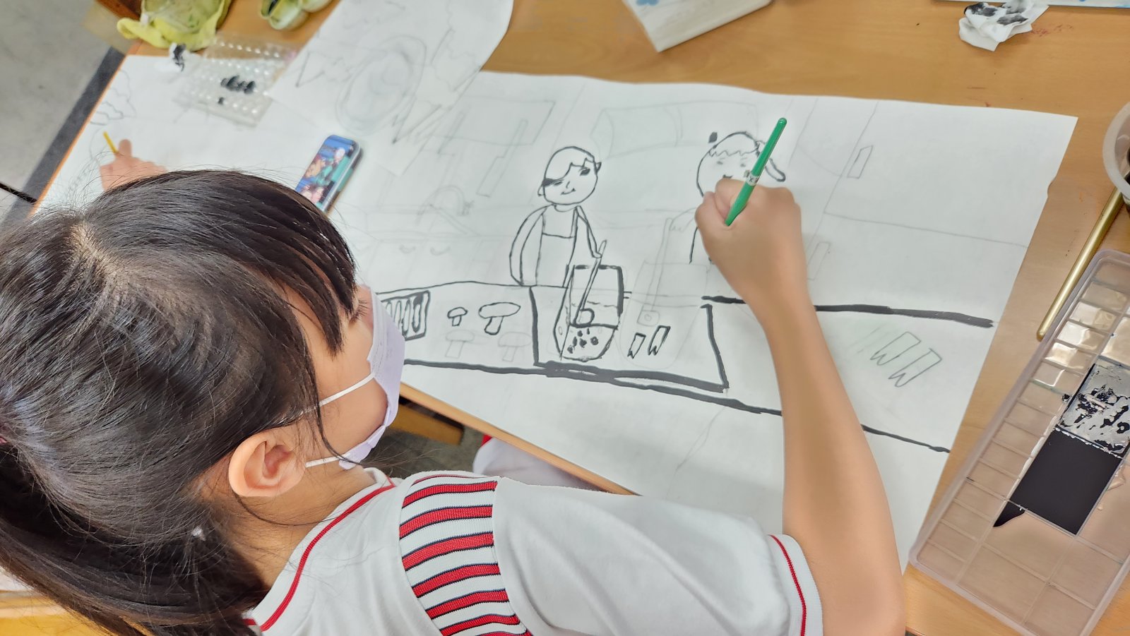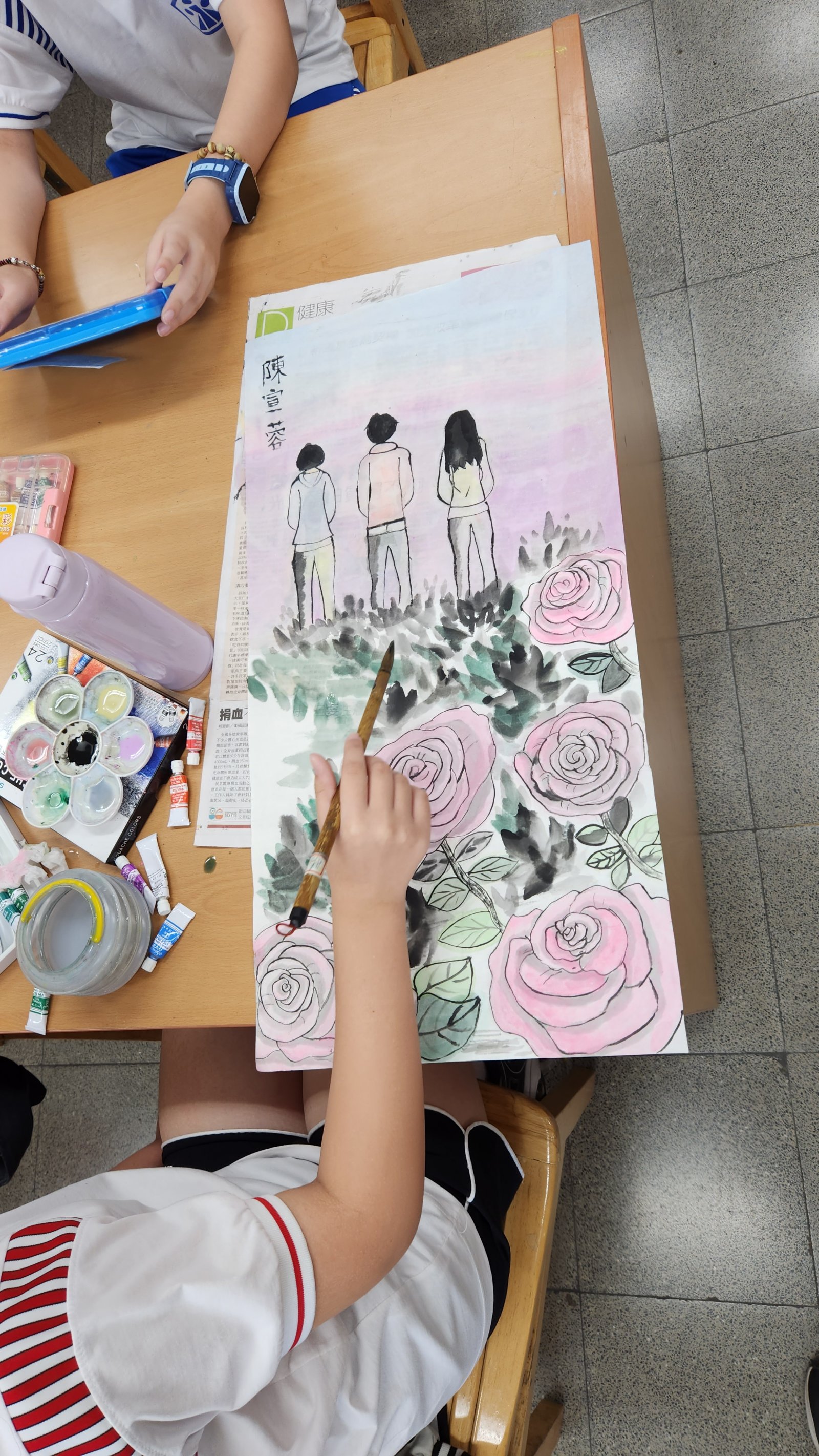 課程設計是由學生的日常生活經驗出發,指導學生運用作文寫作技巧-6何法(人、事、時、地、物以及如何),撰寫出關鍵提示詞,再結合AIGC生成式繪圖文生圖的功能,製作出設計概念圖,接著再指導學生運用構圖法則以及水墨技法進行創作,完成出一幅幅令人驚豔、充滿想像的作品。